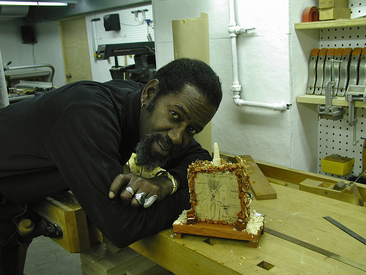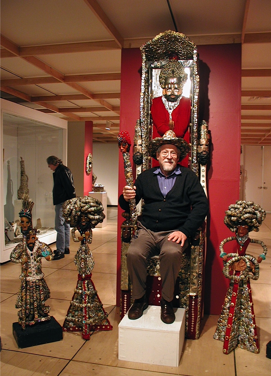 In November 2002 SCC featured Mr. Imagination in a one-person, mind-blowing exhibitionthat remains one of my all-time favorite shows. His art was very accessible, yet substantive. The gallery walls were painted a deep red, his favorite color, and the gallery was stuffed to the brim with his vibrant and expressive art ?furniture, installations, and sculpture ? all of it obsessively covered in bottle-caps and found objects. The centerpiece of the exhibition was a giant throne on which visitors were encouraged to sit. He explained that felt that everyone deserved to feel important and that sitting on a throne made it possible to savor that experience.