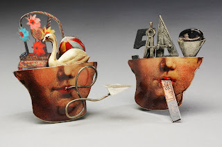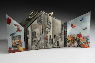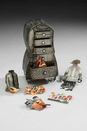 Japanese-born metalsmith, Mariko Kusumoto, creates intimate metal environments that evoke the rich, sensual Japanese culture of her childhood. A brilliant technician, she masterfully fabricates and embellishes boxes using a variety of techniques including etching, electroforming, and patination. With astounding attention to detail she explores interior spaces, deftly transforming each compartment into interactive miniature theaters, revealing figures and objects with dozens of movable parts, rotating gears, and musical mechanisms.?